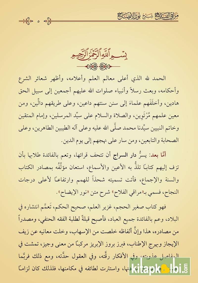 On yedinci yüzyılın (h. XI) büyük hanefî fukahâsından Allâme Şürünbülâlî’nin (Rahimehullâh), kendisine ait olan ve Osmanlı medreselerinde ders kitabı olarak okutulan “Nûru’l-Îzâh” isimli eserine yazmış olduğu “Merâkı’l-Felâh” şerhi iki yazma nüshaya mukabele edilerek yayıma hazırlanmıştır.